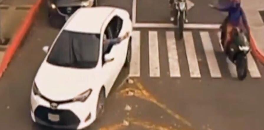 Una cámara de seguridad grabó el momento exacto en el que, tras una discusión en el tráfico, el conductor de un vehículo desenfundó su arma y disparó contra un motorista en la 2a calle y 8a avenida de la zona 14.