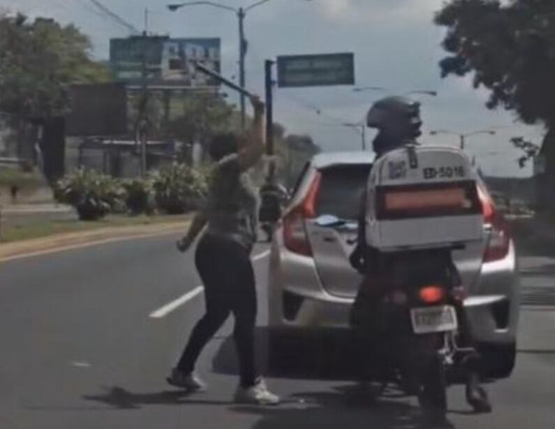 Antes de volver a subir a su automóvil, la mujer golpea el vehículo de dos ruedas y rompe uno de los retrovisores, mientras el motorista intenta evitar el enfrentamiento.