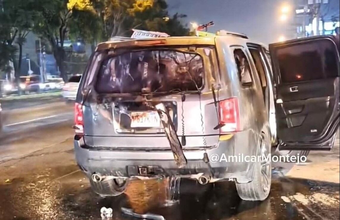 Según la versión de las autoridades de la Policía Nacional Civil (PNC), sujetos en moto dieron alcance al carro y le lanzaron objetos hasta incendiarlo.