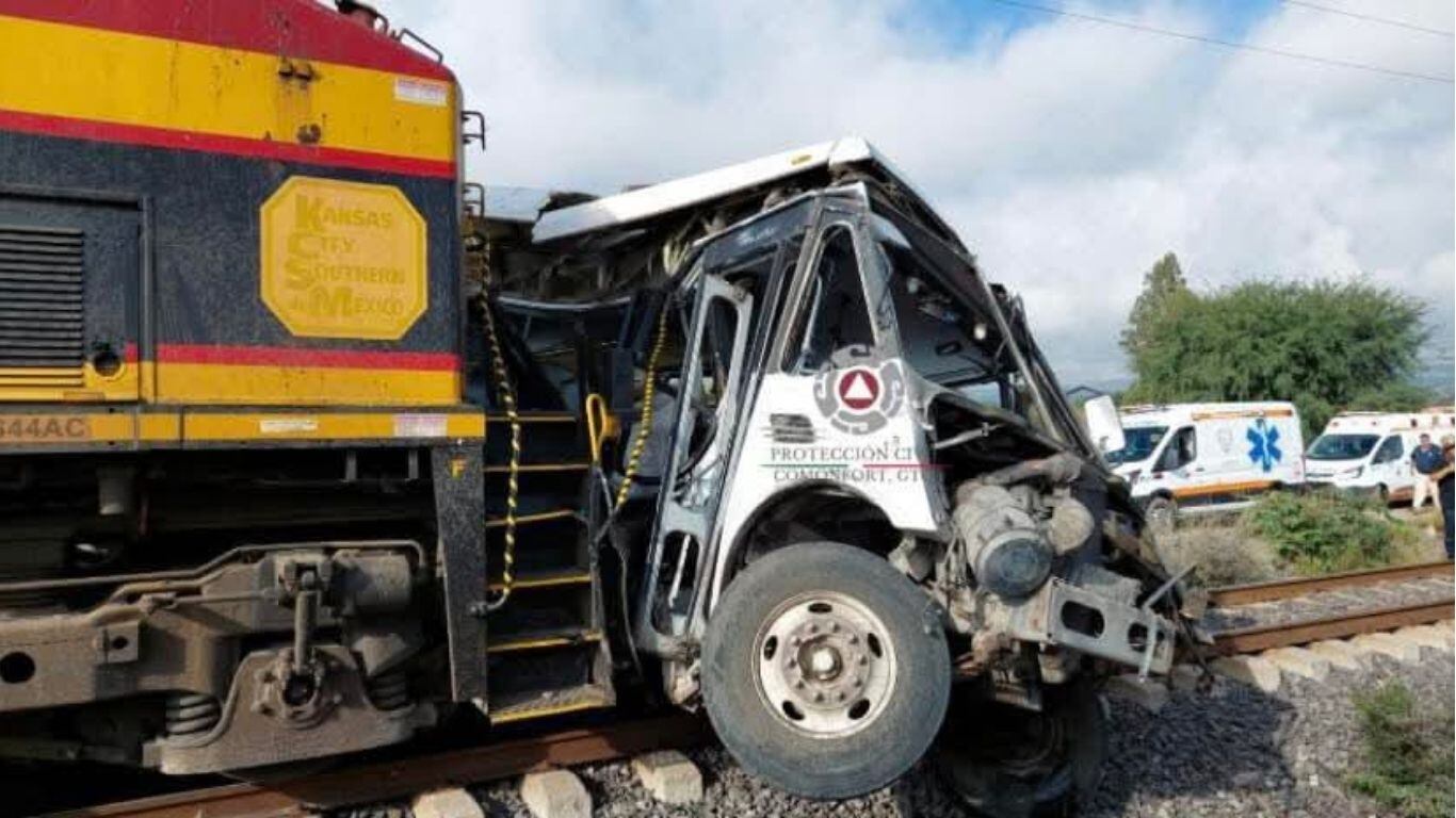 La mañana de este sábado 27 de septiembre se registró un fuerte accidente en la comunidad de La Nopalera, municipio de Comonfort, Guanajuato, donde un camión de pasajeros de la empresa Morados fue impactado por un tren de la compañía Kansas City, lo que dejó como saldo preliminar cinco personas fallecidas y al menos diez lesionados.