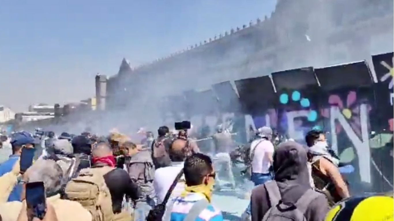 Los contingentes que llegaron al Zócalo de la Ciudad de México comenzaron a escalar y golpear las vallas que protegen el Palacio Nacional. Entre gritos y con tubos y otros objetos, personas encapuchadas arremetieron contra las estructuras metálicas en un intento por derribarlas.