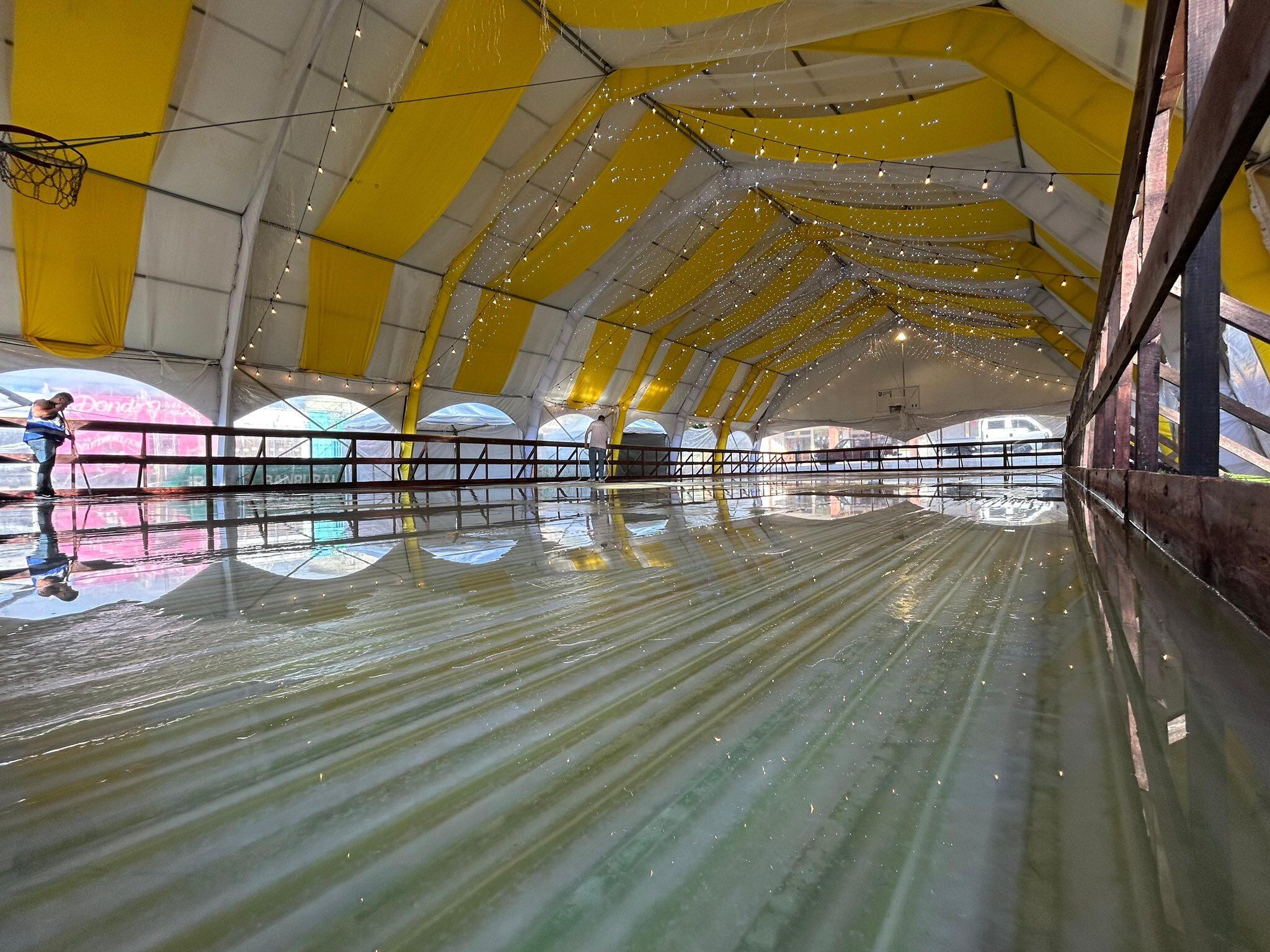 En fotos compartidas por el alcalde, se pudo observar que la pista de hielo ya está siendo instalada en su totalidad.