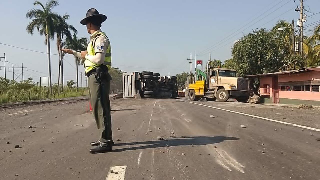 La patrulla de tránsito de Provial se encuentra regulando la circulación en el kilómetro 66 de la ruta CA-2 Occidente, en Escuintla, tras el vuelco de un camión registrado esta mañana.