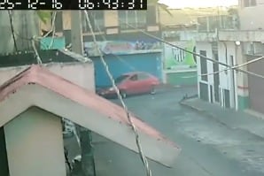 Una cámara de seguridad captó el momento en que un vehículo “rebotó” contra la pared de una farmacia comunitaria ubicada en un sector de Mazatenango, Suchitepéquez.