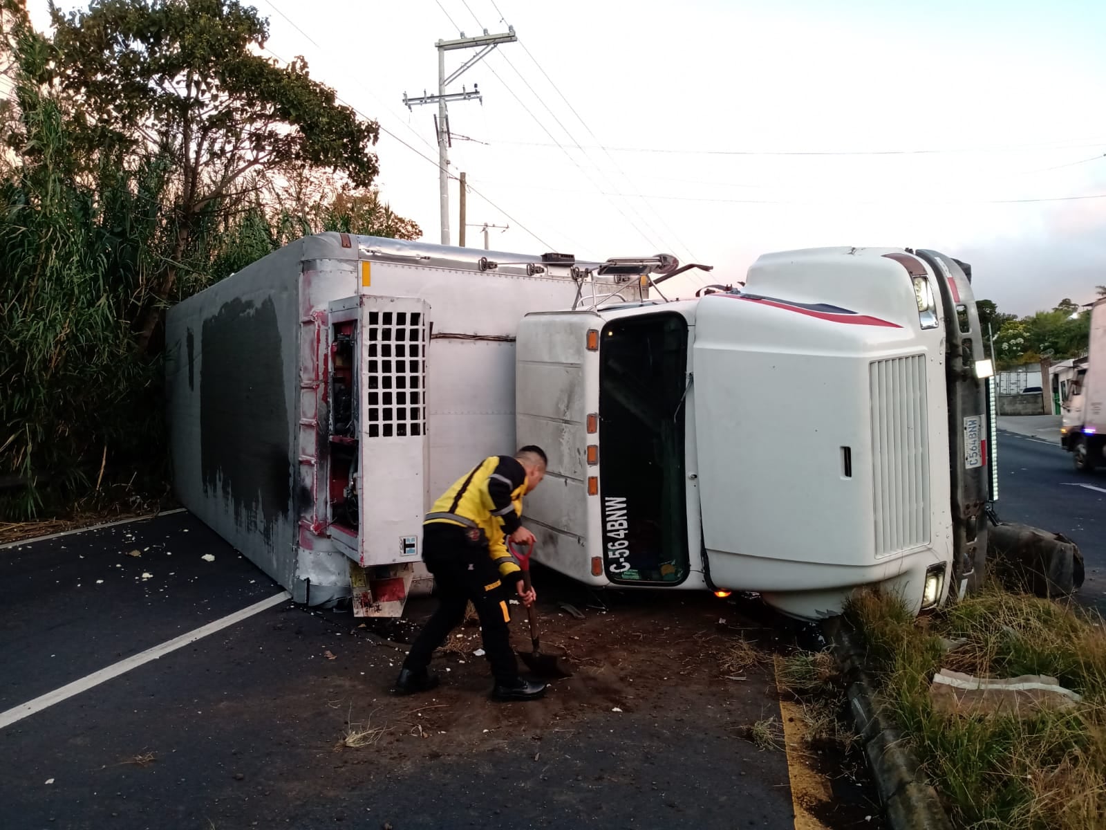 La mañana de este sábado se registró un nuevo percance vial en uno de los tramos más complicados de la red vial guatemalteca. Un tráiler con placas comerciales 564 BNW volcó mientras transitaba por la conocida curva «El Chilero», ubicada en el kilómetro 33 de la carretera que conduce hacia El Salvador. El incidente movilizó de inmediato a los cuerpos de socorro para atender la emergencia.