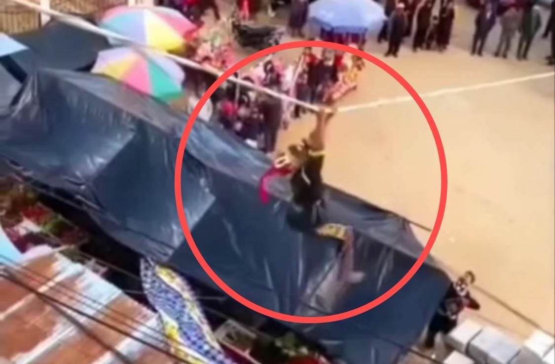 Según se observa en un video que circula en redes sociales, una persona que participaba en la danza se encontraba suspendida de una cuerda, pero con el paso de los segundos comenzó a perder fuerzas hasta caer primero sobre un techo de lámina y posteriormente al suelo.