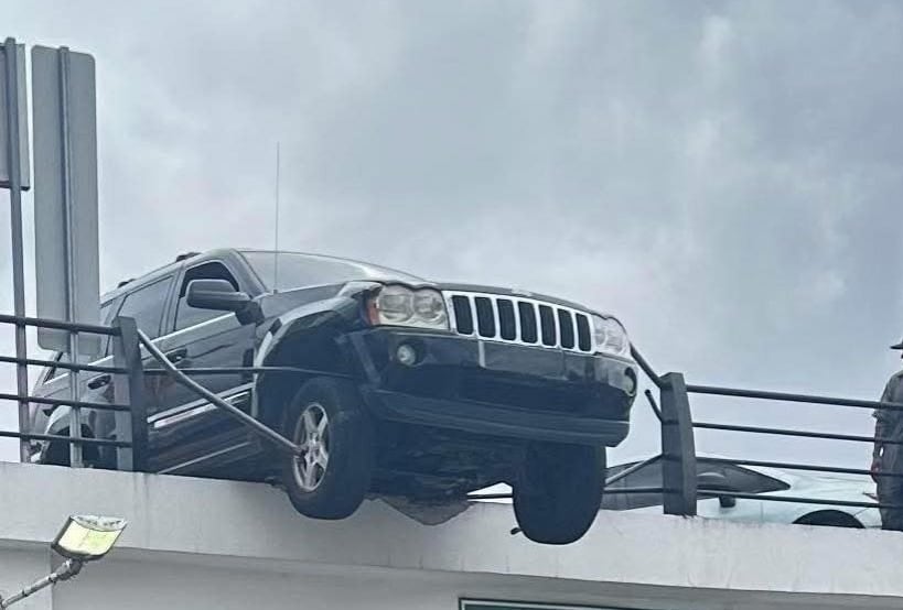 Una fotografía ha sido compartida en redes sociales, en la que se observa a un vehículo tipo camioneta quedar peligrosamente a la orilla del segundo nivel de una estructura, aparentemente un parqueo, donde estuvo a punto de caer al vacío.
