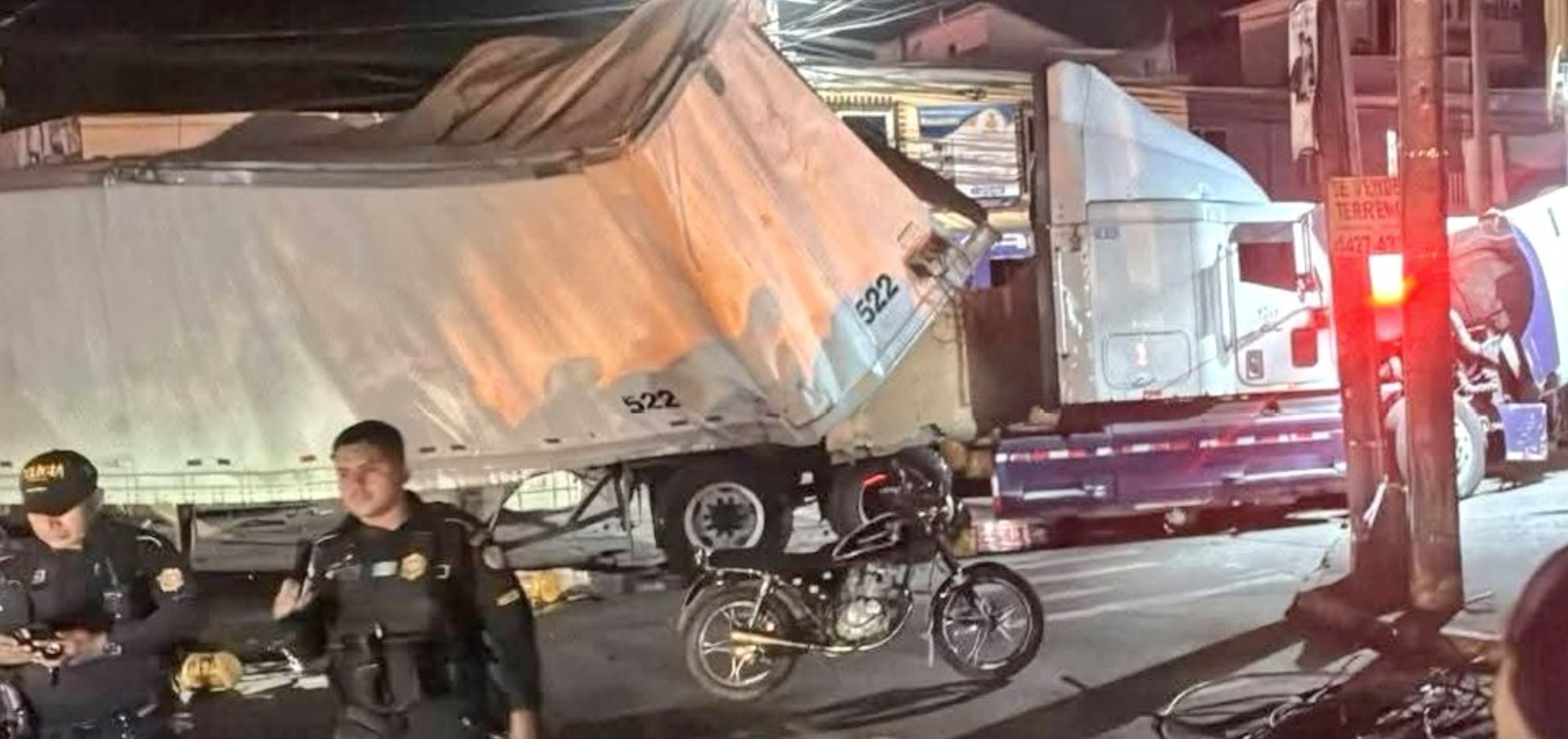 Un hecho de tránsito mantiene completamente bloqueada la 4.ª calle, a la altura de los semáforos de la avenida Centroamérica, en Escuintla, luego de que un tráiler derribara varios postes en el sector y chocara con comercios en el área.