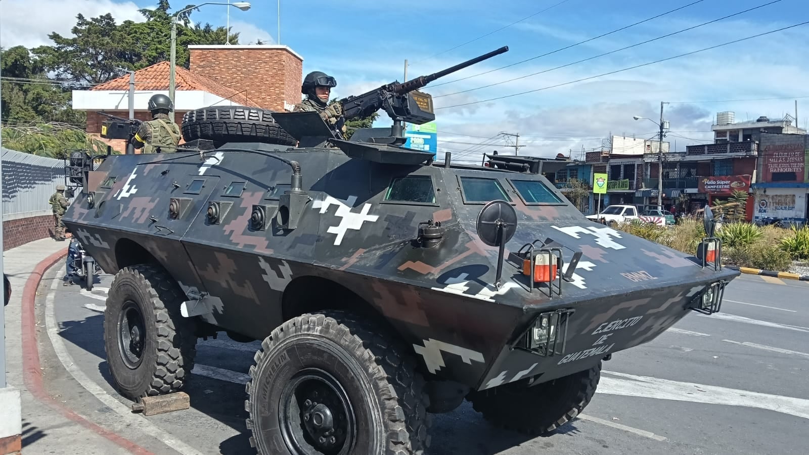 Un vehículo blindado tipo “Armadillo” del Ejército de Guatemala fue colocado en el ingreso a la colonia Maya, zona 18, como parte de los operativos de seguridad que se desarrollan en el sector durante el estado de sitio vigente.