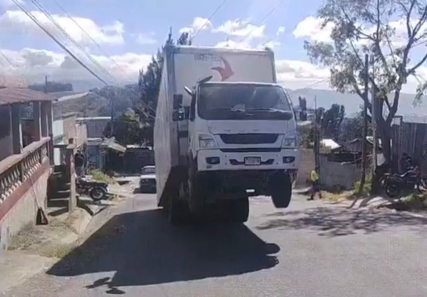 Un hecho insólito se registró la mañana de este jueves 5 de febrero, cuando un camión de mensajería quedó colgando sobre dos ruedas tras no soportar el peso de su carga.