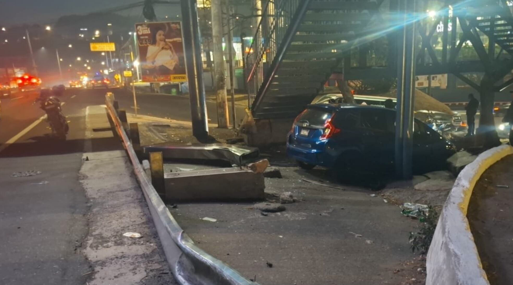 Un accidente de tránsito se registró durante la noche del sábado 21 de febrero en el kilómetro 17 de la Ruta al Pacífico, en jurisdicción de Villa Nueva, donde un vehículo terminó empotrado en la base de una pasarela.