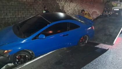 En una grabación compartida por la autoridad de tránsito se observa un vehículo dentro de una cuneta a un costado de la vía, con riesgo de quedar volcado.