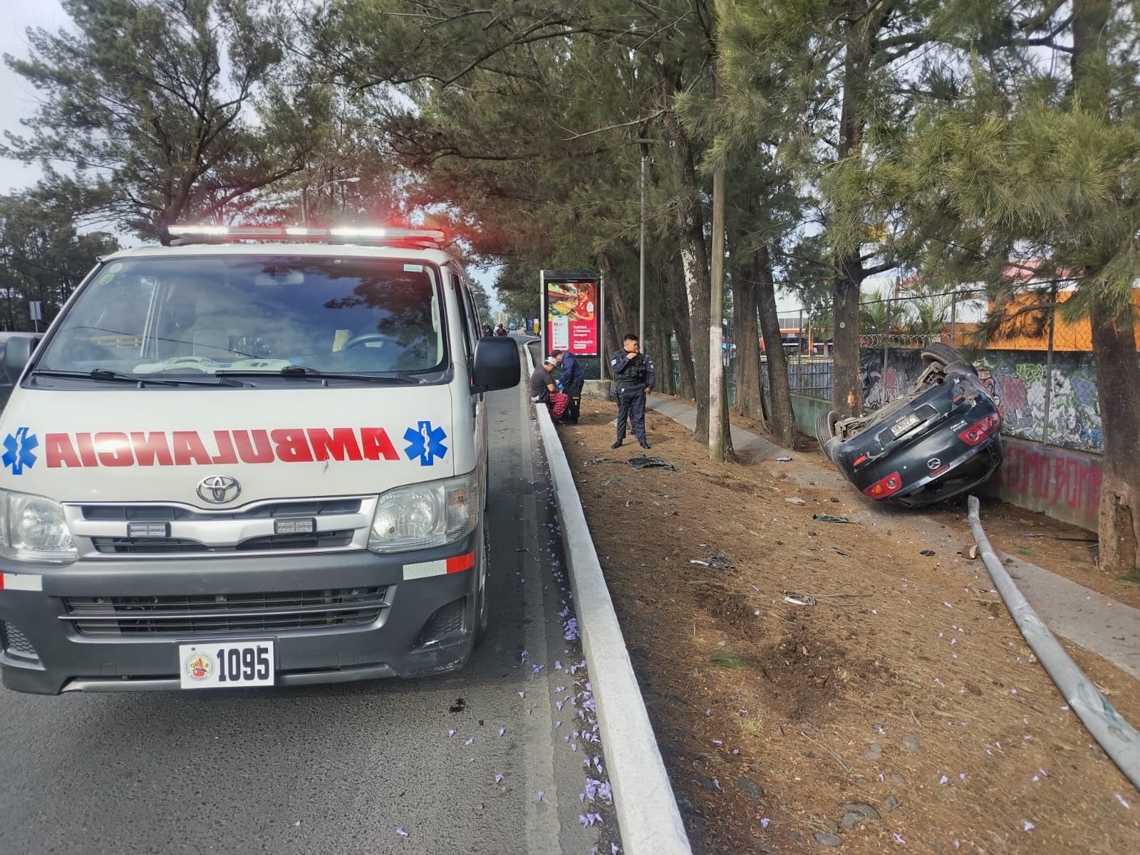 Un vehículo quedó volcado en el carril derecho del Periférico, en el tramo que conduce de puente San Juan hacia puente Roosevelt, en la zona 7 capitalina.