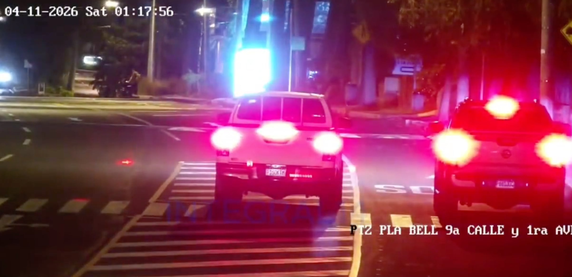 Un incidente fue captado por cámaras de seguridad de Integral 14, donde se observa a dos picops participando en una carrera clandestina en la zona 14 de la Ciudad de Guatemala.