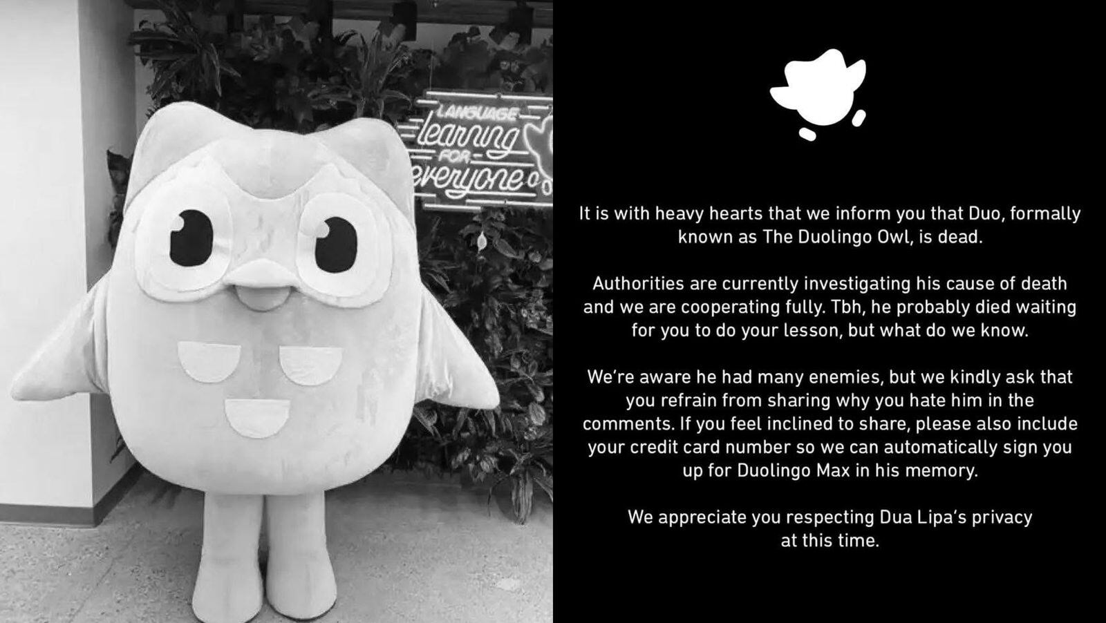 “Con gran pesar les informamos que Duo, anteriormente conocido como el Búho de Duolingo, ha fallecido.” Así comienza el comunicado, para luego soltar la broma que todos veían venir: “Para ser honestos, probablemente murió esperando a que hicieras tu lección, pero ¿qué sabemos nosotros?”