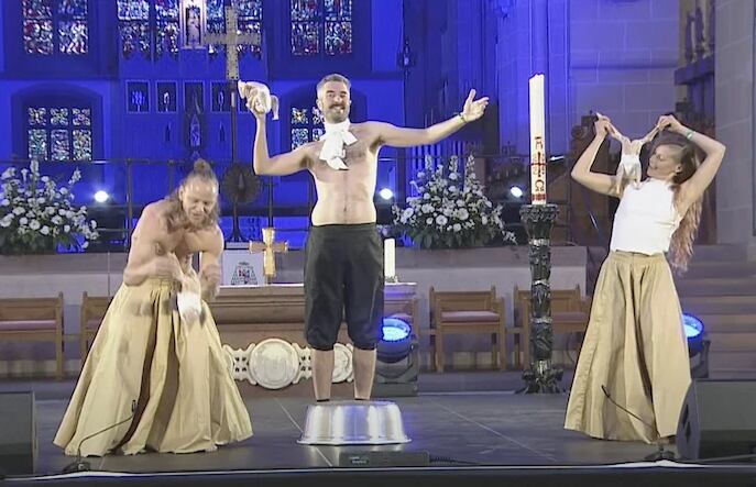 El grupo Bodytalk presentó “Westfalen Side Story”, una actuación en la que actores semidesnudos blandiendo guadañas y portando pollos desplumados envueltos en pañales bailaron de manera provocativa frente al altar, el crucifijo y el cirio pascual, al ritmo de una versión modificada de la canción “Fleisch ist Fleisch” (“La carne es carne”). La presentación se realizó ante la presencia del arzobispo Marcus Bentz y otras autoridades eclesiásticas.