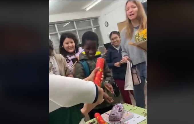 Una estudiante corre a llamar a la educadora, quien rápidamente va a separar a los supuestos agresores. La mujer entra apurada al salón y se acerca gritando los nombres de los implicados en la supuesta pelea. Los chicos están como en un círculo rodeando a los presuntos contrincantes, pero cuando la docente, abren el círculo y es en ese momento cuando ella nota, que no estaban tapando a los luchadores, sino a quienes le tenían su regalo.