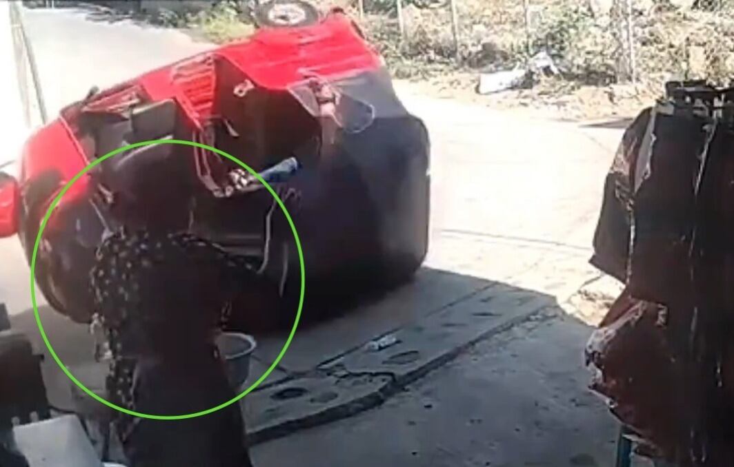 Internautas compartieron la grabación de una cámara de vigilancia que captó el momento exacto en el que una mujer que vendía comida a la orilla de una calle de Jalapa, se salva de ser aplastada por un mototaxi que perdió el control.