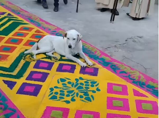 En un video que se hizo viral en redes sociales otro perrito protagonizó la destrucción de una alfombra en un cortejo procesional ayer martes santo, está vez fue captado en Antigua Guatemala.