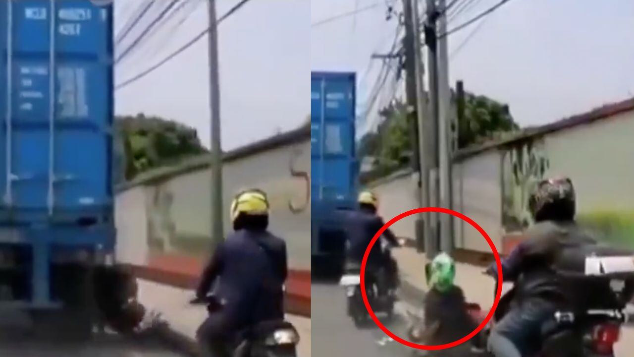 Sí, en las imágenes se puede ver cómo el involucrado intentó pasar a la pesada unidad por la derecha. Lamentablemente, el motociclista no validó bien el espacio y acabó por impactarse contra la banqueta.