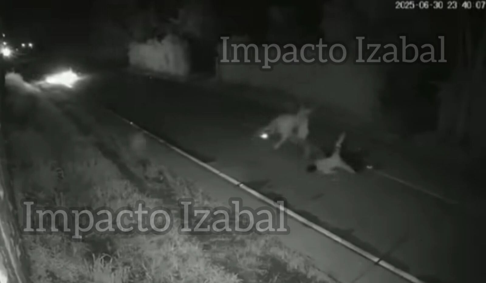 Las imágenes de una cámara de seguridad captaron el momento exacto en el que un burro que transitaba por una carretera es embestido por un motorista en la aldea creek Zarco, Morales Izabal.