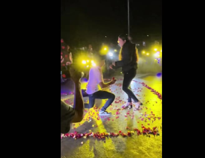 En el video compartido por testigos, se observa un romántico escenario preparado con pétalos en forma de corazón, en el que el protagonista sorprende a su pareja. La escena fue acompañada por un grupo de motociclistas, quienes celebraron el momento con alegría, aplausos y hasta un “coro” de motos encendidas.