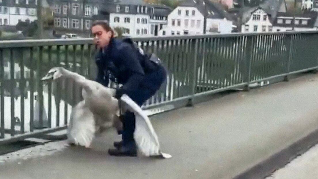 Un curioso video protagonizado por una agente de policía en la ciudad alemana de Bernkastel-Kues se ha vuelto viral, luego de que la uniformada apareciera “arrestando” a un cisne que deambulaba por un puente.