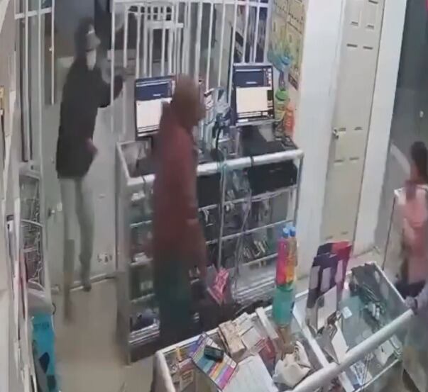 En las imágenes se observa cómo dos sujetos ingresan las rejas de seguridad del comercio, uno de ellos se lanza con una de las mujeres que se encuentra en el lugar y que pide ayuda.