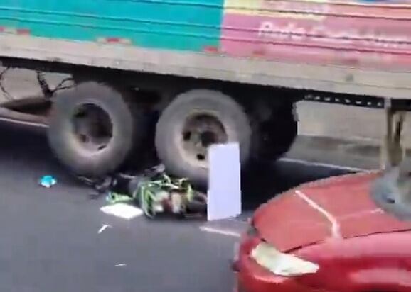 De acuerdo con las imágenes de un video que circula en redes sociales, el conductor de la motocicleta quedó bajo un tráiler, pero logró salir con vida, evitando ser aplastado por el vehículo pesado.