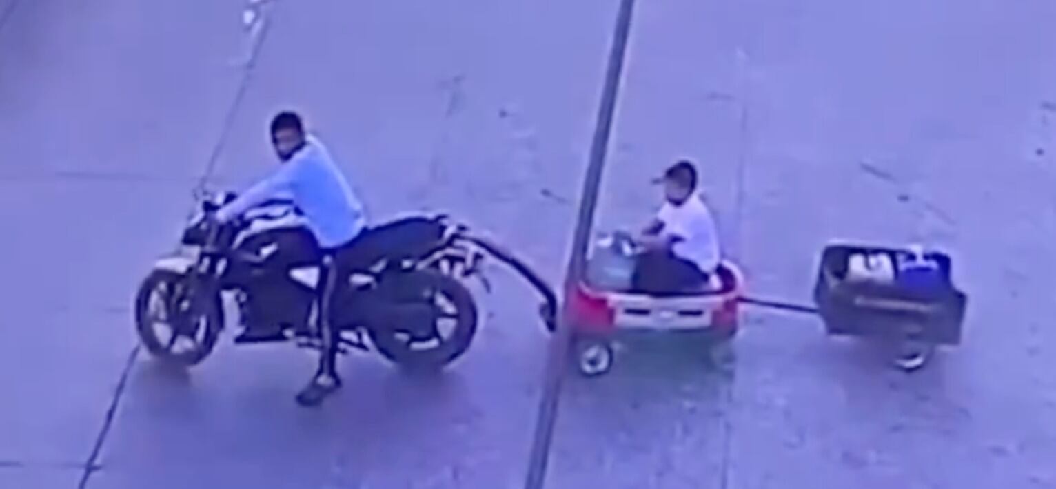En las imágenes se observa a una persona que se desplaza en motocicleta mientras traslada en un carrito improvisado a un niño, exponiéndolo de manera irresponsable.