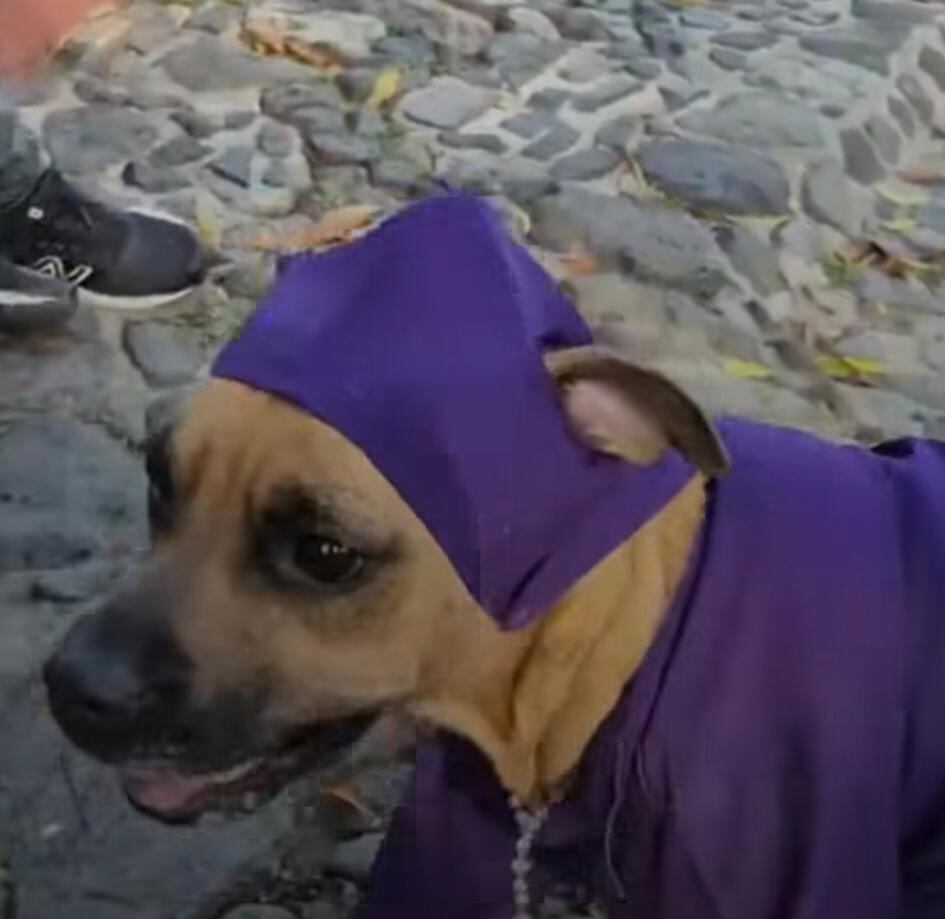 El can vestía una camiseta morada y un gorrito del mismo color, atuendo característico de los cucuruchos durante la Semana Santa, lo que rápidamente despertó simpatía entre los presentes.